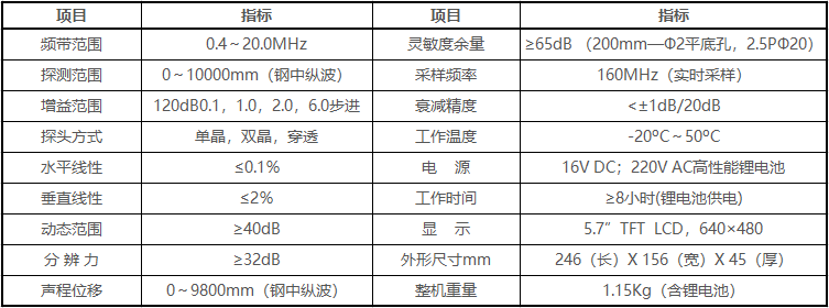 - 缺陷回波參數(shù)(距離、垂直、水平、波幅、dB或當(dāng)量孔徑值)實時顯示;多次波探測缺陷的實際深度可直接顯示。