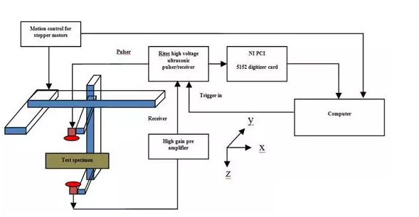 a.空氣耦合超聲波C掃描成像系統PC和超聲波脈沖發生器接收機系統;b.X-Y掃描儀