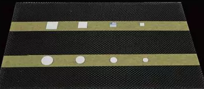 北航設計了一套空氣耦合超聲檢測系統,并用此系統檢測了蜂窩夾芯復合材料,制備預埋缺陷的紙蜂窩夾芯復合材料結構試樣如圖所示。試樣蒙皮厚度約為1mm、蜂窩芯厚度約為10mm。蜂窩夾芯復合材料試樣的空氣耦合超聲C掃描圖像,其中缺陷特征清晰可辨,驗證了空氣耦合超聲檢測技術應用于蜂窩夾芯復合材料脫粘檢測的可行性。