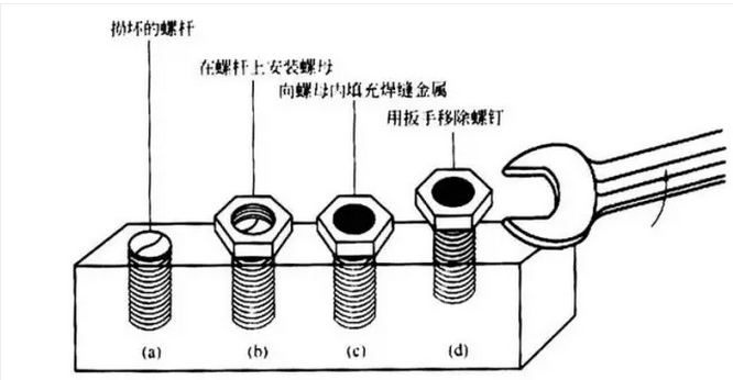 ② 如果螺釘槽、螺母或牙槽損壞或丟失,可以在螺釘頭的上部(或殘余部分)放置一個螺母,旋緊螺母,然后采用任何焊接方法在螺母和螺釘的內部填充金屬。這樣就會將螺母和螺釘殘余部分連接起來,然后在螺母上放置扳手或牙鉗,迅速拔出螺釘。采用這種方法有利于提供一個新的握力點并可利用熱量使螺釘緊固,用焊接方法移除固定螺釘的殘余部分示意如圖4所示。