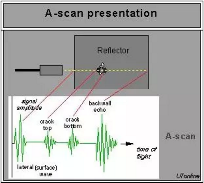 (1)A掃描來源于英文單詞Amplitude,即幅值的意思,也即顯示器的橫坐標是超聲波在被檢測材料中的傳播時間或者傳播距離,縱坐標是超聲波反射波的幅值。